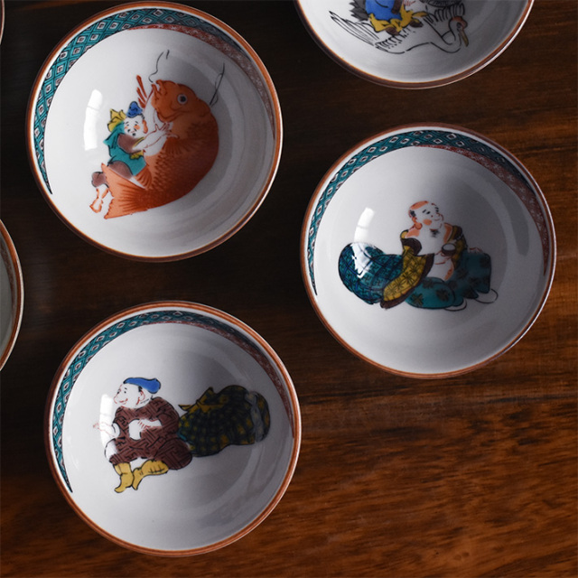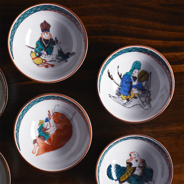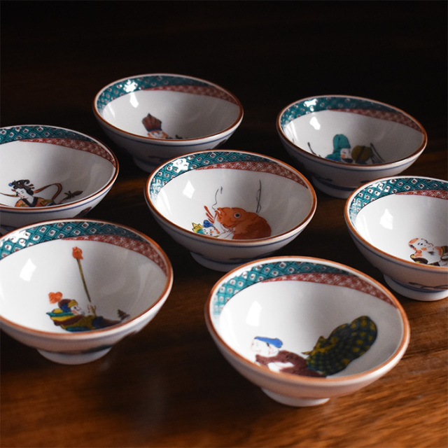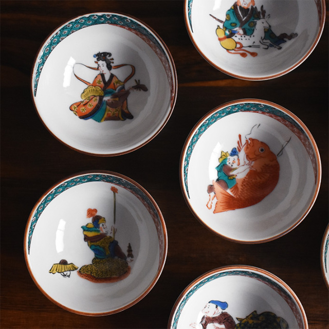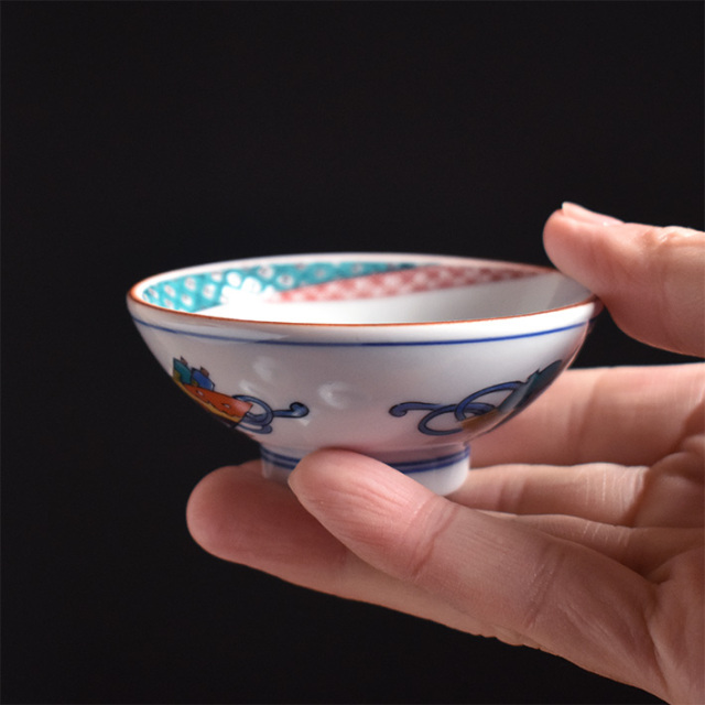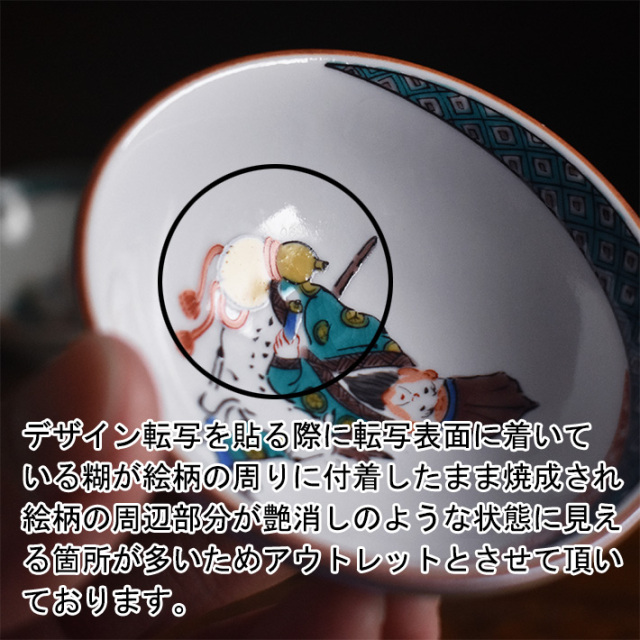 【アウトレットの理由】 デザイン転写を貼る際に転写表面についている糊が絵柄の周りに付着したまま焼成され絵柄の周辺部分が艶消しのような状態に見える箇所が多いためアウトレットとさせて頂いております。正規品でも見られる状態でがありますが当社の検品基準で除外させて頂いております。ご贈答品としてはお薦めできません。またアウトレット商品の為、輸送中の破損以外でのご返品・キャンセルは不可となります。 九谷焼のぐい呑、盃コレクション、伝統的な画風から現代的なデザインまで多様な種類で楽しむことができます。実際に盃/ぐい呑として使用する機会は少ないかもしれませんが、注がれたお酒を通して見る味わい深い画風の数々は実に趣があります。使うたびに選ぶ楽しみもまた魅力です。盃やぐい呑は他の和食器とは違い実用性だけではなくコレクション性の高さも人気の器です。お酒を呑まない方々でも盃やぐい呑をコレクションされている方々もたくさんいらっしゃいます。土の素朴な風合いで仕上げられたぐい呑なども実に味があり野趣に溢れていますが九谷焼の磁器に色絵が描かれた作品もまた美しさをお楽しみ頂ける作品群ではないでしょうか。眺めて楽しむもよし、一献かたむけてもよし。楽しみが多い器、それがぐい呑、盃かと思います。 ※焼成の際に重ねて移動する事があるため表面に極小の擦れ傷がある場合がございます、また焼成により器表面に所々艶がない部分や小さな凹凸があります。粘土に含まれる鉄分が小さな点として見える場合もありますことご了承お願い致します。 |