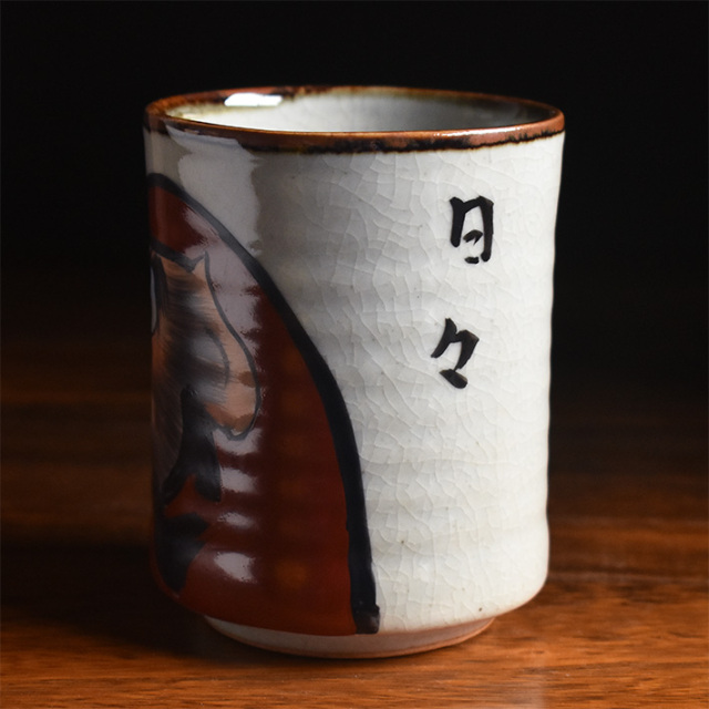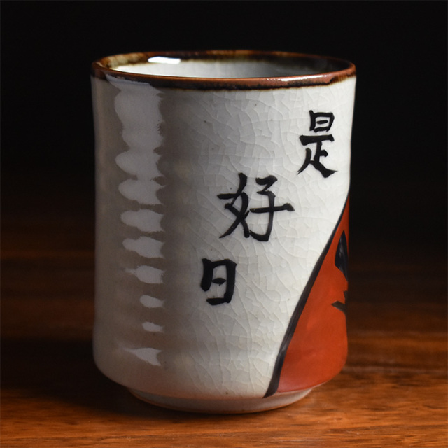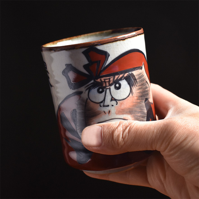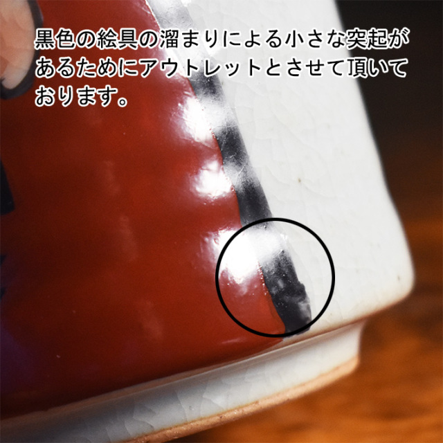 【アウトレットの理由】 黒色の絵具の溜まりにより小さな突起があるためアウトレットとさせて頂いております。長期保管されていた作品となりますため外箱に汚れがある場合がございます。ご贈答品としてはお薦めできません。またアウトレット商品の為、輸送中の破損以外でのご返品・キャンセルは不可となります。 厳つく見えるがどこか愛嬌がある。 今までありそうでなかったこのデザイン、九谷焼のデザインは一般的には花鳥風月的な自然や動物をモチーフにした画風が多く、それ以外のデザインは連続文様や小紋などが大半を占める。そんな中で登場してきたのが、このダルマの図である。仕上がってきた作品を見た時に、素直に「こんな九谷焼もいいかも」と思ってしまいました。少し大き目サイズ、いわゆる寿司湯呑と呼ばれる湯呑に迫力のあるダルマが鎮座するその姿、男心がゆらゆら動く無骨な感じ。土の荒々しい感じとかではなく、あくまでもデザインがみせる無骨さがたまらなくカッコいいなと思うのです。 |
