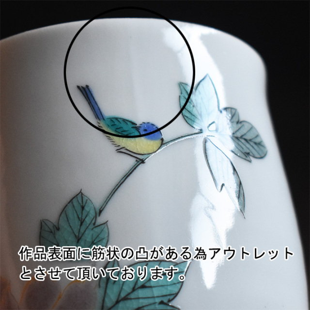 【アウトレットの理由】 器の表面に筋状の凸箇所がありますためアウトレットとさせて頂いております。ご贈答品としてはお薦めできません。またアウトレット商品の為、輸送中の破損以外でのご返品・キャンセルは不可となります。 穏やかな時間とともに 小鳥がさえずる穏やかな風景をデザインしました。全体的に優しい色彩で統一された湯呑みは、ほのぼのとした雰囲気に包まれています。高精度の転写技術で再現された九谷焼の色絵デザインは安定的な美しさを生み出し、普段使いの器として九谷焼を広く楽しんで頂ける技術革新の成果として多くの方々よりご支持頂いております。 |