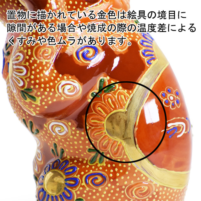 癖の強さが九谷焼招き猫の真骨頂 一言で言えば「雰囲気のある招き猫です」現在、製作されている九谷焼の招き猫も他の招き猫に比べるとかなり個性的でクセが強いデザイン、色合いですが、それでも時代に合わせ少しづつスマートになっている気がします。本来はこの招き猫のように威圧的でどこかおどろおどろしい雰囲気が九谷焼の招き猫のように思います。正直、子供の頃、展示してある招き猫を見て怖かった記憶があります。古き良き九谷焼の招き猫をお楽しみ頂ける個性が尖がった作品となります。 作品名に「オールドタイプ」の記述のある作品は現在、製作されている作品ではなく以前に製作されたクラシックな趣の作品になります。本来の九谷焼の置物の味わいをお楽しみ頂ける特徴的な色褪せ具合や金色のムラ、擦れなどがあります。量産品として製作される前の職人本位の自由な絵付けが魅力がこのオールドタイプになります。 ※ご紹介中の作品写真は撮影用の作品となりますので実際お求め頂く作品と色の濃淡や絵柄の配置位置などに若干違いがございますことご了承お願い致します。 |