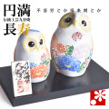 不苦労、福来朗を願いて 穏やで愛らしく優しさに満ちた表情の夫婦のふくろう、その表情は絶対的な絆を感じさせてくれます。ふくろうの置物は世界中で幸運の鳥として大切にされているモチーフですが日本では、不苦労や福来朗などの語呂合わせや「福来」(福が来るの意味)「福籠」(福が籠にたくさんつまった様子)「福老」(幸福に年をとる)などのように縁起ものとして愛されるモチーフです。また夜行性ということ家の守り神や番人、夜目が利くことから先見の明あるとも言われています。海外では「知恵の神」「文芸の神」「森の護り神」とされています。 九谷焼のふくろうの置物が登場したのは近年になってからです。もともと招き猫等の縁起物が作られていた経緯から世界中で愛されている縁起物ふくろうをモチーフに置物専門の窯元により製作されたのが始まりです。しかし誕生から間もない九谷焼のふくろうですが、あっという間に縁起物のスタンダードとなり大切な記念日の記念の御品としてご支持頂いております。ふくろうという愛らしいモチーフ、九谷焼の置物ならではの鮮やかかつ斬新な色彩、デザインの融合が単に縁起物という枠ではなくアートオブジェとしての価値も高いことが人気の要因だと思います。一生に一度の大切な記念日に贈る記憶に残る御品としてお選び頂ければ幸いです。 ※薄い色彩(主に薄茶色)で塗り込まれている部分では塗ムラや擦れなどがあります。 ※ご紹介中の作品写真は撮影用の作品となりますので実際お求め頂く作品と色の濃淡や絵柄の配置位置などに若干違いがございますことご了承お願い致します。 |