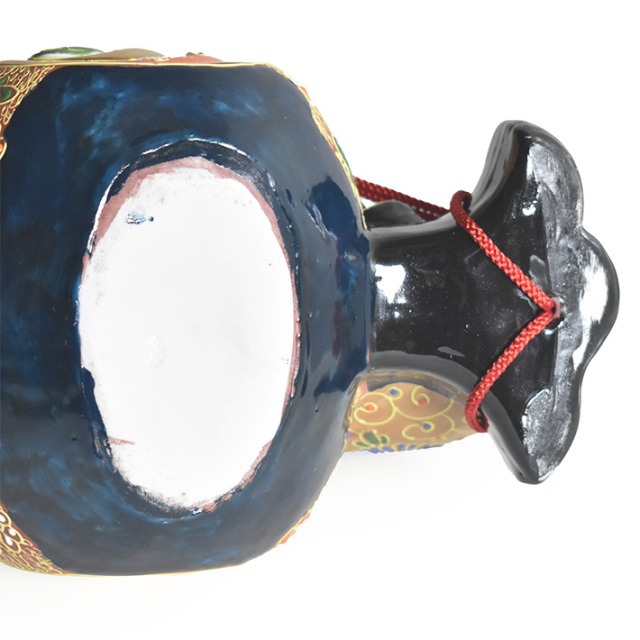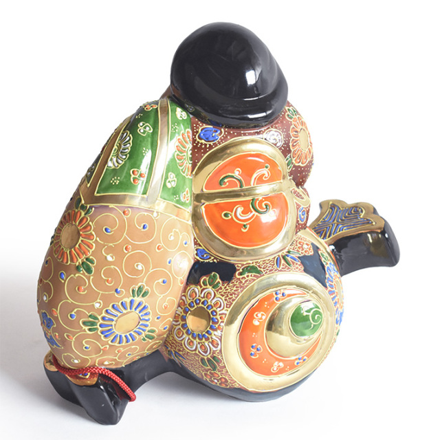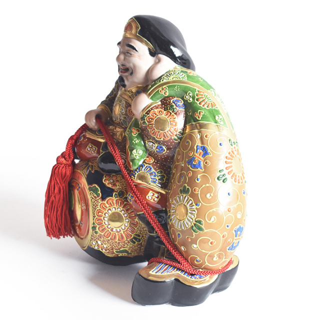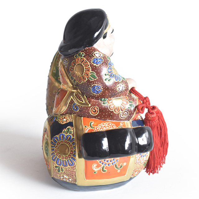 優しいお顔がかもす福々しい雰囲気 今では日本でもよく知られている神様の1柱、大黒様、その昔、戦いの神であった大黒天が日本に伝承される中で金運や蓄財の神様と変化したと云われています。戦いの神であった頃の恐ろしい形相ではなく福しいお顔と欲しいものが振れば出る打ち出の小槌、そしてモノではない七つの宝物が入っていると言われる大きな袋を担いだ姿は正に福の神そのものです。作品名にある「盛(もり)」とは九谷焼の置物の特徴でもある「盛(もり)技法」と呼ばれる絵付技法により彩色された作品です。盛技法は粘度の高い絵具をデコレーションケーキにクリームを絞り出す方法と同じ要領で厚く盛り上げる絵付技法となり、その盛り上がった絵具により生まれる立体的な紋様や風合いは、どこか謎めいた神秘的な美しさを創りだします。手仕事での彩色ですので若干、色の濃淡(ムラ)がありますことご了承下さい。 ※ご紹介中の作品写真は撮影用の作品となりますので実際お求め頂く作品と色の濃淡や絵柄の配置位置などに若干違いがございますことご了承お願い致します。 ※伝統的な技法で彩色されております九谷焼の置物作品では薄い絵具で塗り込まれている部分では塗りムラや色ハネがあります。また金色で絵付けされている部分では金色の発色に違いがあったり擦れやくすみがありますことご了承お願い致します。 |