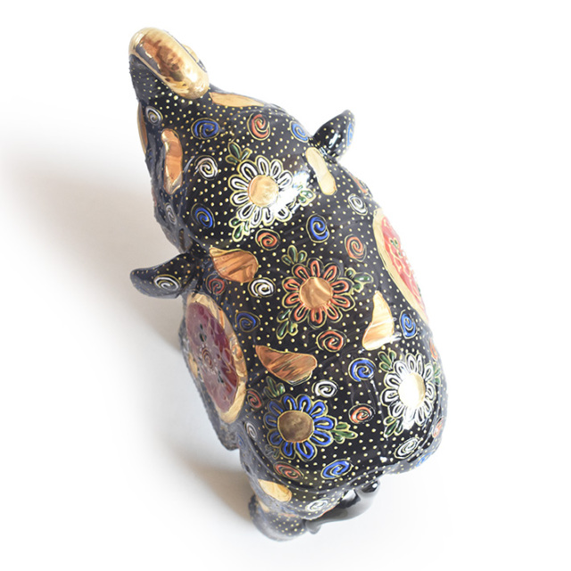九谷焼の置物の新シリーズの発表になります。「デコモリコレクション」その第一弾は「象」をモチーフとした作品が完成致しました。「デコモリ技法」につきましては下記にて説明させて頂いております。九谷焼の置物の中でもこの「デコモリ」という独特な彩色技法で絵付された作品、かなりインパクトの強いビジュアルで迫ってきます。このシリーズを製作するきっかけとなったのが置物専門の窯元で見た古い貿易用資料でした。紙は既に茶色に変色し写真はモノクロ、でも当時はこの資料(カタログ)を作るのに相当な費用がかかったものだと思います。所々に記される英文での説明書きから歴史を感じることができました。詳しい話を聞いてみると当時、九谷焼の貿易が盛んだった頃、インドから欧州にかけての富裕層からの特注品として作られたのが「象」の置物だったそうです。一説には海外での評価を得る為に描きだされたのがこの独特な雰囲気を生み出す「デコモリ技法」だということも聞いています。そんな先人達の海外への挑戦の歴史を知り、今一度この「デコモリ」を当時のクオリティで再現したいという想いで製作したのがこのシリーズになります。![]() この一冊との出逢いが教えてくれたのは “JAPAN KUTANI”として九谷焼が世界に挑戦していた 先人たちの歴史と華麗なオブジェ(置物)の存在でした。 セピア色の写真の中で輝きを放つ作品達を復活させたい そんな想いを抱かせてくれた一冊。海を渡り世界に挑戦したこの「デコモリ作品」を当時のクオリティで再現したいという想いで復刻製作したのがこの凸盛シリーズになります。 第一弾に「象」を選んだのも当時の貿易の足がかりになった作品だからという理由からです。圧倒的な存在感を放つ仕上がりになりました。力強い造形美と丁寧に施された「デコモリ」の神秘的な彩色。現代でも充分、通用するその完成されたデザイン、一つのアートとして海外に認めれた九谷焼のオブジェを、ぜひご堪能下さい。 置物に描かれている金色は絵具の境目に隙間がある場合や焼成の際の温度差によるくすみ色ムラがあります。また作品ごとに絵柄の配置や配色に若干違いがある場合もございます。 |