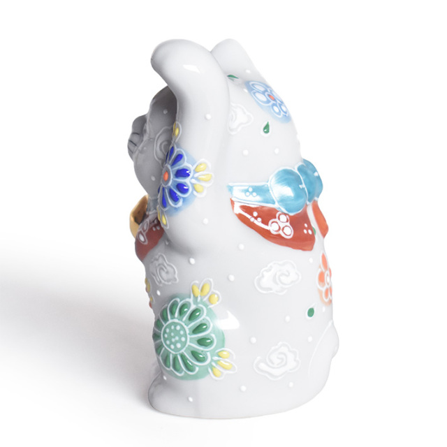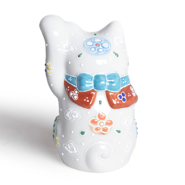 正統派な九谷焼の招き猫です 真っ白なボディに九谷焼の置物ならではのデコラティブな絵付けで彩られた上品で愛らしい作品です。少し小ぶりなサイズは飾る場所を選ばずお気に入りの場所に置いていつも傍に感じて頂ける招き猫かと思います。デコラティブな作品の中でも繊細さを感じられる絵付は高い技術を持った職人の手仕事ならではの逸品です。 ※製作に使用されています磁器粘土に含まれる鉄分が焼成後に小さな黒い点として作品表面に見られる事と粘土の粒子による小さな凹凸がある場合がございます。また置物に描かれている金色は絵具の境目に隙間がある場合や焼成の際の温度差によるくすみ、擦れがあります。薄い色合いの絵具で塗り込まれている部分には塗ムラや濃淡がありますこともご了承お願い致します。 ※ご紹介中の作品写真は撮影用の作品となりますので実際お求め頂く作品と色の濃淡や絵柄の配置位置などに若干違いがございますことご了承お願い致します。 |