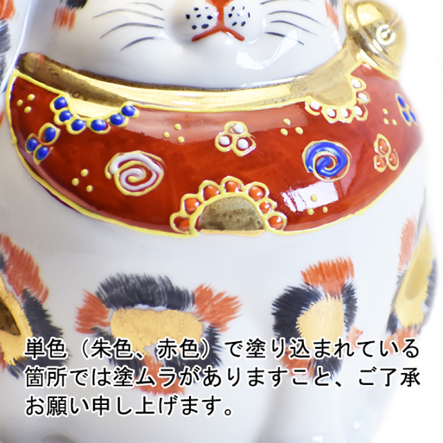 ほのぼのと穏やかな時間を感じる微笑み ずんぐりとしたボディと満面の笑み、この招き猫ちゃんのまわりには穏やかな時間の流れを感じることができます。伝統的な三毛柄と所々に配されたデコラティブな盛絵具での装飾が九谷焼の招き猫らしい雅な雰囲気を醸しております。この微笑みに癒されるのは間違いありません。笑いのあるところに福来る。 ※製作に使用されています磁器粘土に含まれる鉄分が焼成後に小さな黒い点として作品表面に見られる事と粘土の粒子による小さな凹凸がある場合がございますこと、ご了承お願い致します。また薄い色合いの絵具で塗り込まれている部分には塗ムラや濃淡がありますこともご了承お願い致します。 ※置物に描かれている金色は焼成の際の温度差によるくすみ色ムラがあります。また作品ごとに絵柄の配置や配色に若干違いがある場合もございます。 ※ご紹介中の作品写真は撮影用の作品となりますので実際お求め頂く作品と色の濃淡や絵柄の配置位置などに若干違いがございますことご了承お願い致します。 |