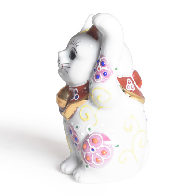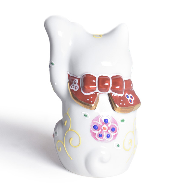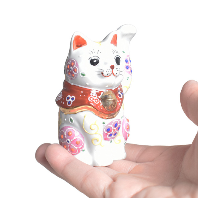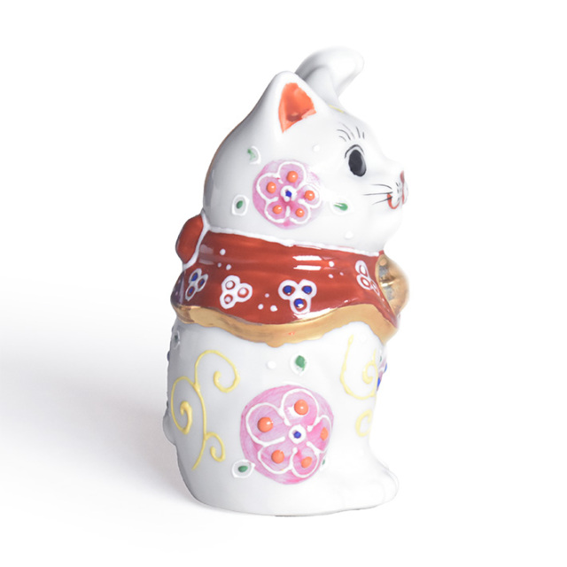 小花で彩るシンプルモダンな招き猫 細身で小ぶり、手の平に乗せることができるサイズ感の招き猫です。近年は少し丸みを帯びた招き猫が多い中ですっとした綺麗目な姿が印象的な作品に仕上がっております。コンパクトなサイズと可愛らしすぎない大人可愛い感のある作品は飾って頂ける場所の選択肢を広げてくれます。 愛らしい梅の花と唐草模様を立体的に描いたシンプル可愛い仕上がりの作品です。伝統的な技法と現代的なデザインを上手く組み合わせたシンプルモダンな招き猫かと思います。 ※製作に使用されています磁器粘土に含まれる鉄分が焼成後に小さな黒い点として作品表面に見られる事と粘土の粒子による小さな凹凸がある場合がございますこと、ご了承お願い致します。また薄い色合いの絵具で塗り込まれている部分には塗ムラや濃淡がありますこともご了承お願い致します。 ※置物に描かれている金色は焼成の際の温度差によるくすみ色ムラがあります。また作品ごとに絵柄の配置や配色に若干違いがある場合もございます。 ※ご紹介中の作品写真は撮影用の作品となりますので実際お求め頂く作品と色の濃淡や絵柄の配置位置などに若干違いがございますことご了承お願い致します。 |