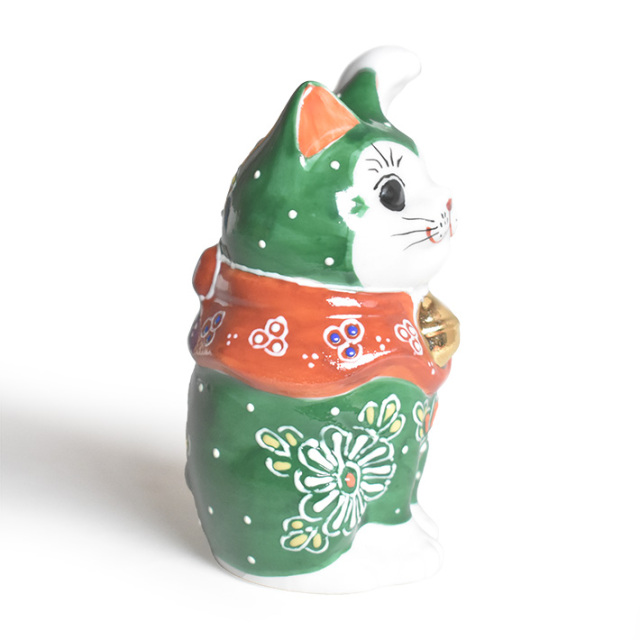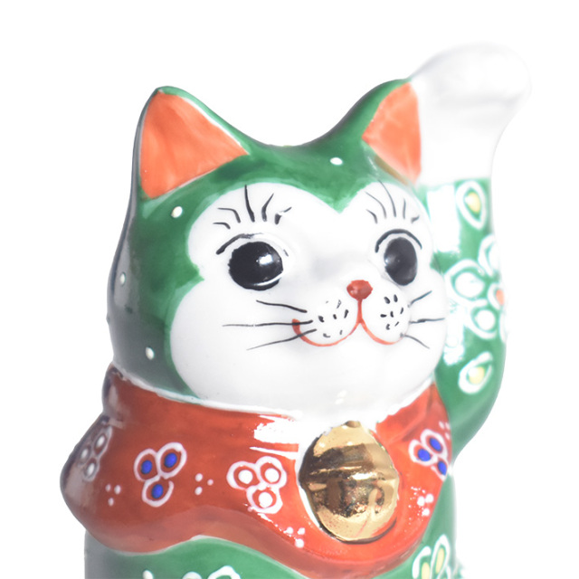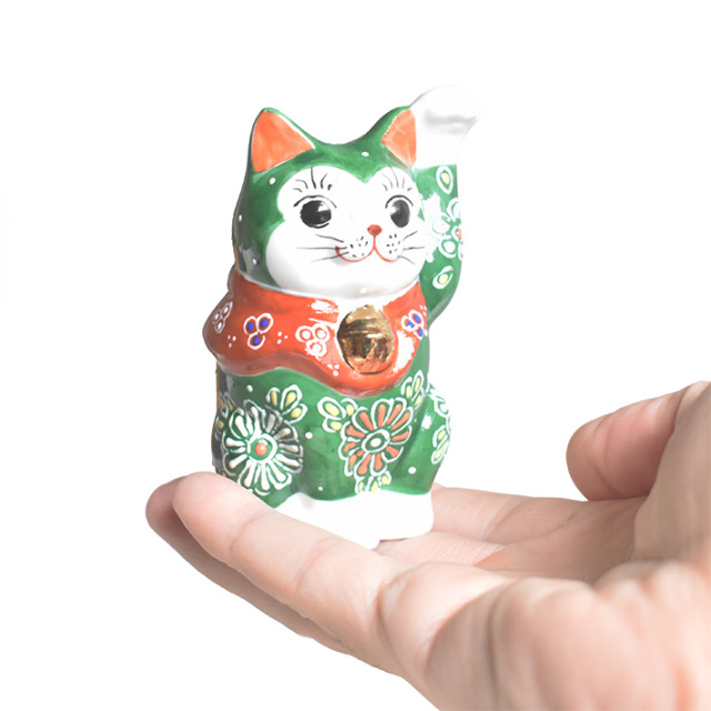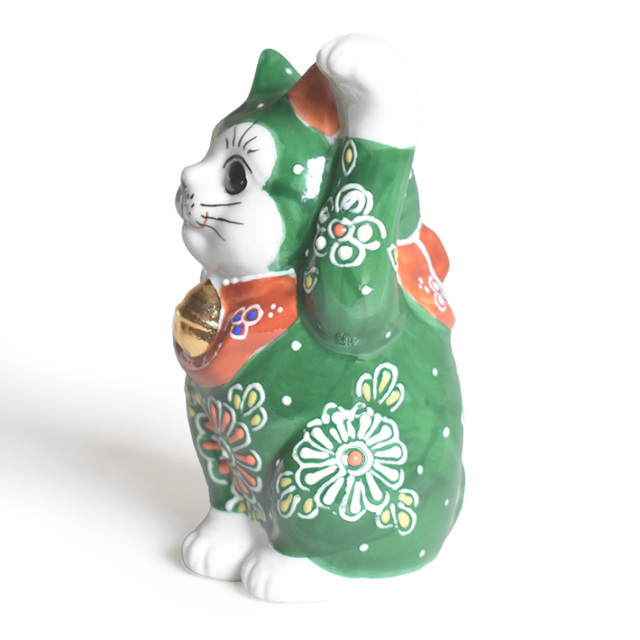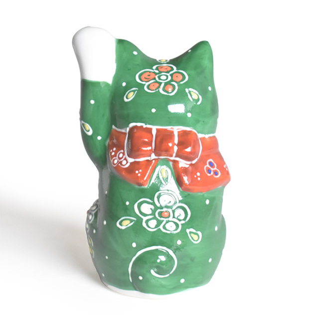 心、穏やかにしてくれる緑の趣 細身で小ぶり、手の平に乗せることができるサイズ感の招き猫です。近年は少し丸みを帯びた招き猫が多い中ですっとした綺麗目な姿が印象的な作品に仕上がっております。コンパクトなサイズと可愛らしすぎない大人可愛い感のある作品は飾って頂ける場所の選択肢を広げてくれます。 九谷焼の伝統的な置物の絵付け技法、凸(デコ)盛技法で立体的に彩色された作品です。眺めているだけで心が穏やかになる、そんな緑色で彩られた招き猫です。 ※製作に使用されています磁器粘土に含まれる鉄分が焼成後に小さな黒い点として作品表面に見られる事と粘土の粒子による小さな凹凸がある場合がございますこと、ご了承お願い致します。また薄い色合いの絵具で塗り込まれている部分には塗ムラや濃淡がありますこともご了承お願い致します。 ※置物に描かれている金色は焼成の際の温度差によるくすみ色ムラがあります。また作品ごとに絵柄の配置や配色に若干違いがある場合もございます。 ※ご紹介中の作品写真は撮影用の作品となりますので実際お求め頂く作品と色の濃淡や絵柄の配置位置などに若干違いがございますことご了承お願い致します。 |