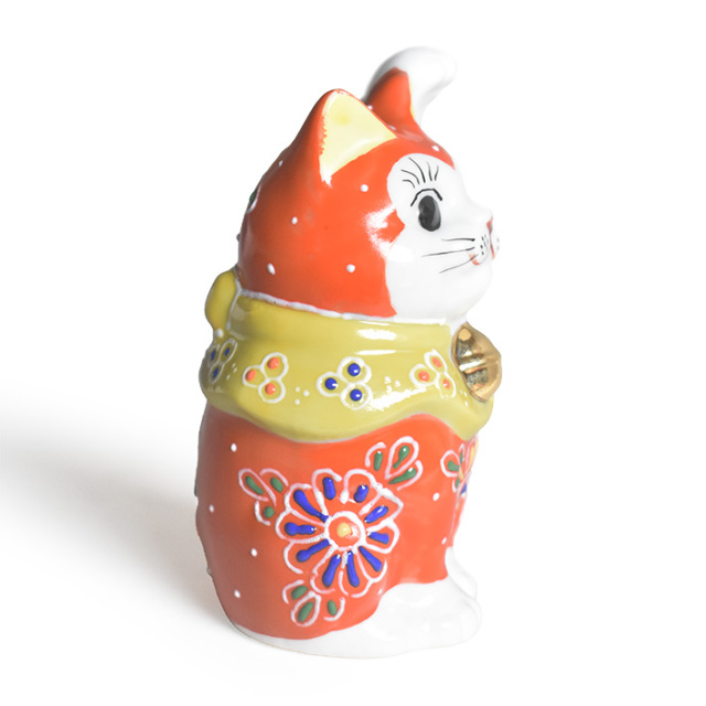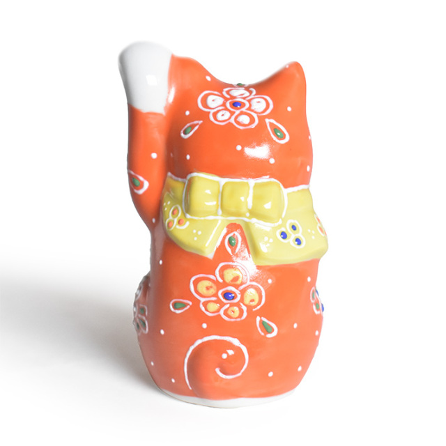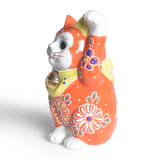 元気をもらえるビタミンカラー 細身で小ぶり、手の平に乗せることができるサイズ感の招き猫です。近年は少し丸みを帯びた招き猫が多い中ですっとした綺麗目な姿が印象的な作品に仕上がっております。コンパクトなサイズと可愛らしすぎない大人可愛い感のある作品は飾って頂ける場所の選択肢を広げてくれます。 九谷焼の伝統的な置物の絵付け技法、凸(デコ)盛技法で立体的に彩色された作品です。傍に飾っているだけで元気を分けてもらえそうなビビットなオレンジカラーの招き猫です。 ※製作に使用されています磁器粘土に含まれる鉄分が焼成後に小さな黒い点として作品表面に見られる事と粘土の粒子による小さな凹凸がある場合がございますこと、ご了承お願い致します。また薄い色合いの絵具で塗り込まれている部分には塗ムラや濃淡がありますこともご了承お願い致します。 ※置物に描かれている金色は焼成の際の温度差によるくすみ色ムラがあります。また作品ごとに絵柄の配置や配色に若干違いがある場合もございます。 ※ご紹介中の作品写真は撮影用の作品となりますので実際お求め頂く作品と色の濃淡や絵柄の配置位置などに若干違いがございますことご了承お願い致します。 |