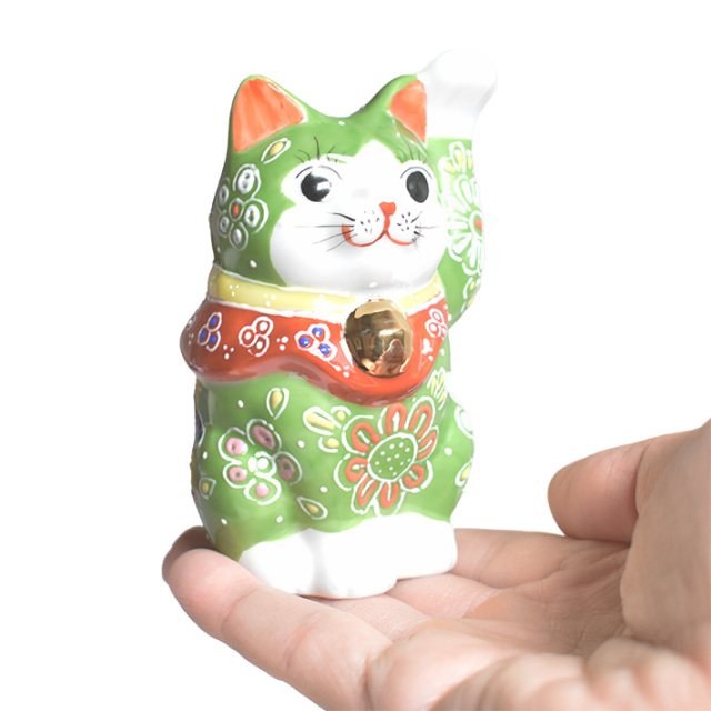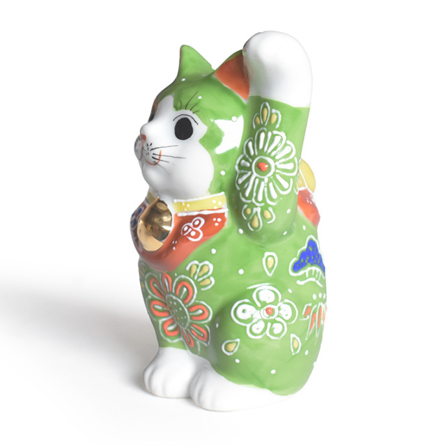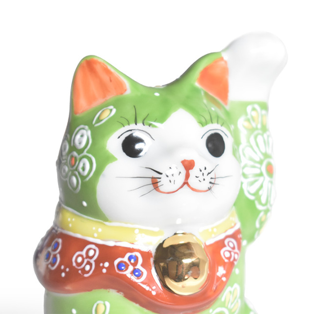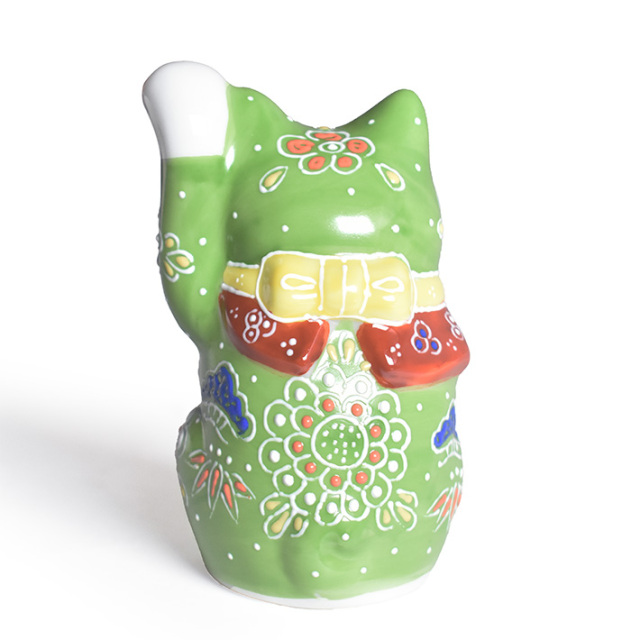 新緑を思わせる黄緑を纏い コンパクトな大きさながらお部屋に飾って頂いても存在感を放つちょうど良いサイズ感の招き猫です。古くから親しまれている定番と言える招き猫の形状に仕上げられています。少し小さめで、それでいて趣もある招き猫らしい招き猫をお探しの皆様にお薦めの作品です。 九谷焼の伝統的な置物の絵付け技法、凸(デコ)盛技法で立体的に彩色された作品です。自然の息吹を感じる、そんな生命力あふれる黄緑色を纏って招き猫です。 ※製作に使用されています磁器粘土に含まれる鉄分が焼成後に小さな黒い点として作品表面に見られる事と粘土の粒子による小さな凹凸がある場合がございますこと、ご了承お願い致します。また薄い色合いの絵具で塗り込まれている部分には塗ムラや濃淡がありますこともご了承お願い致します。 ※置物に描かれている金色は焼成の際の温度差によるくすみ色ムラがあります。また作品ごとに絵柄の配置や配色に若干違いがある場合もございます。 ※ご紹介中の作品写真は撮影用の作品となりますので実際お求め頂く作品と色の濃淡や絵柄の配置位置などに若干違いがございますことご了承お願い致します。 |